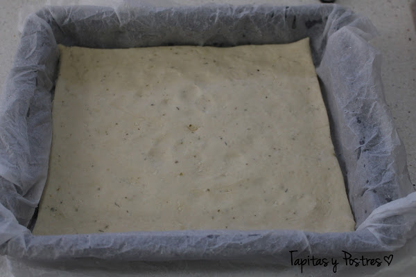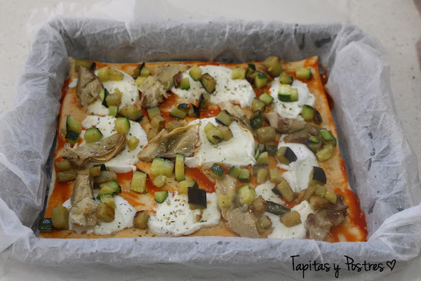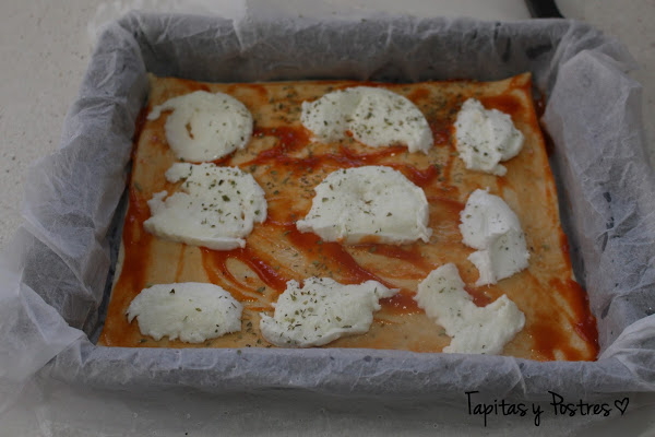 Vamos con la masa, después de reposar, hacemos dos partes (os dará para dos pizzas medianas), la estiramos y la colocamos en una bandeja cuadrada forrada con papel vegetal humedecido (esto sirve para que se adapte a la forma del molde). Podemos darle forma cuadrada si queremos, pero a mi me gustó hacerla cuadrada.