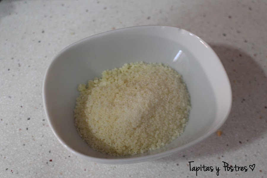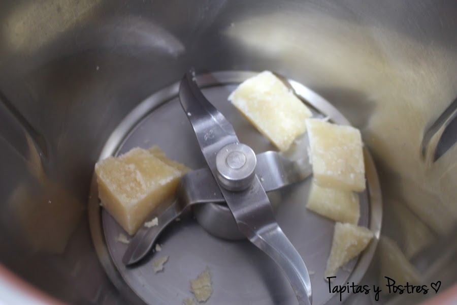Primero haremos la masa. vamos a triturar el queso en la thermomix unos 15 segundos a velocidad progresiva 7-10. Lo reservamos.