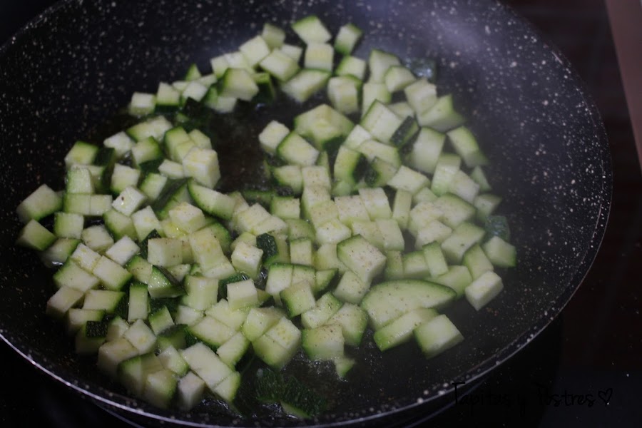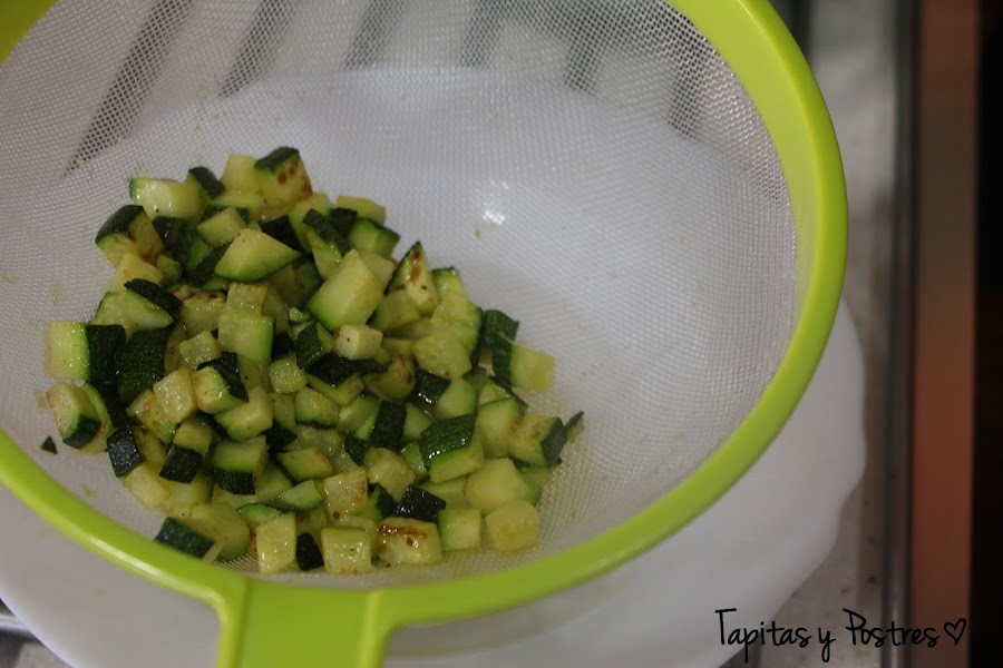 Vamos con el relleno. Picamos el calabacín en cuadraditos con piel y lo vamos a pochar en una sartén con un poco de aceite. Lo salpimentamos y dejamos que se quede ligeramente al dente, pues después lo vamos a hornear. Al acabar, dejamos reposar en un colador para que suelte el agua.