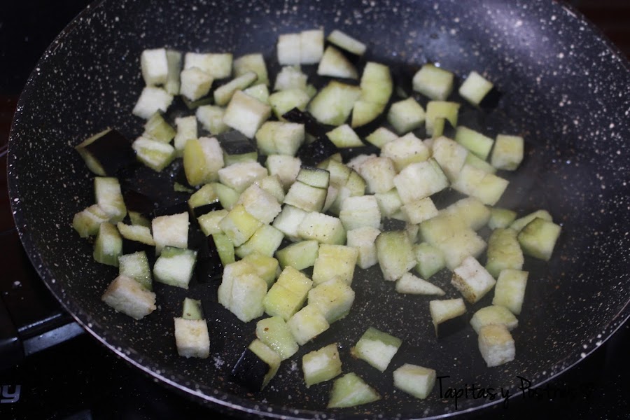 Vamos con la berenjena, lavamos y cortamos también en cuadraditos. Salpimentamos y la pochamos también en una sartén con un poquito de aceite hasta que esté tierna. Reservamos.