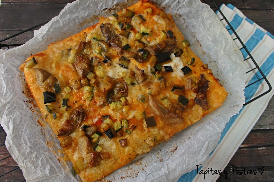 Ponemos tomate frito sobre la masa, rodajas de mozzarella fresca y vamos colocando la verdura que habiamos pochado por encima. Las alcachofas las usamos en conserva, pero las escurrimos bien de liquido. Yo he usado unas alcachofas aliñadas en conserva, cortadas en cuartos y que coloqué por toda la pizza.