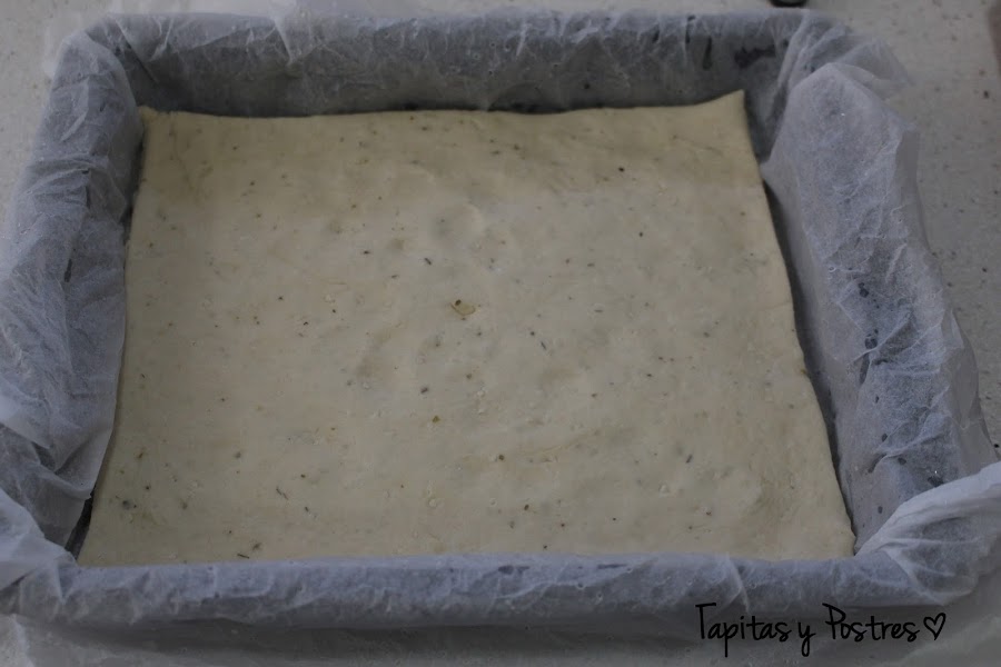 Estiramos la masa y la ponemos en una bandeja cuadrada. O le damos forma redonda. Como os guste más.