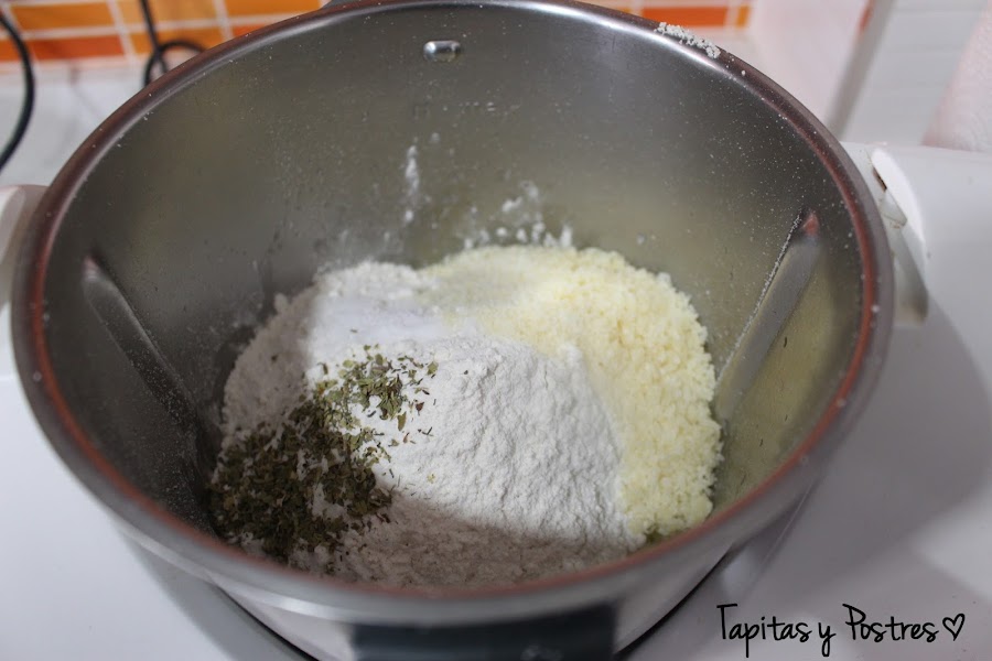 Agregamos la harina, sal, azúcar, orégano y el queso que teníamos reservado. Mezclamos 20 segundos a velocidad 4 y después programamos 3 minutos a velocidad espiga.