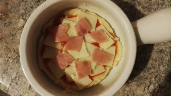 Añadimos el queso y los ingredientes a nuestra elección, en este caso yo corté en cuadritos una rodaja de Mozzarella, una rodaja de Monterrey Jack y una rodaja de Jamón.
