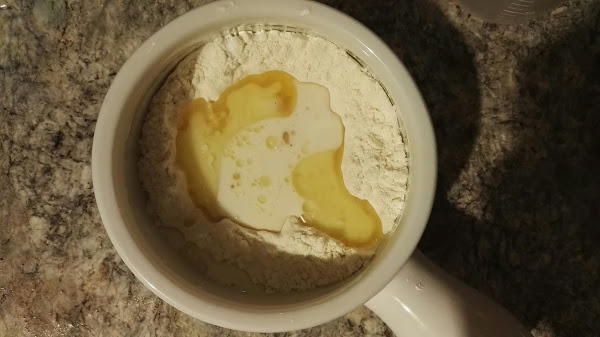 En un tazón pequeño apto para microondas (mejor si no es muy alto porque la pizza no crece como un mug cake dulce), mezclamos la harina, leche, aceite, sal, bicarbonato y levadura.