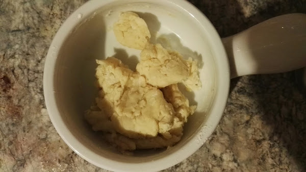 No quiero hacer más preámbulo para esta delicia así que aquí dejo la receta para una porción, solo recomiendo usar cucharas soperas en lugar de medidoras, si igual quedara algo pegajosa la masa, solamente agregar más harina pero por medias cucharaditas hasta que quede una masa que no se pegue ni en las manos ni en el recipiente, que sea como la plastilina :)