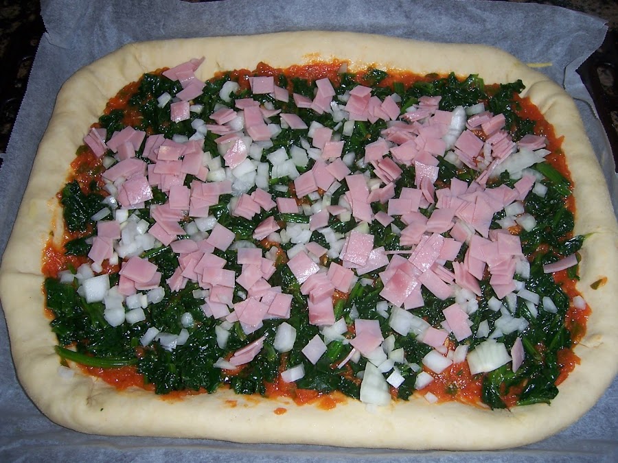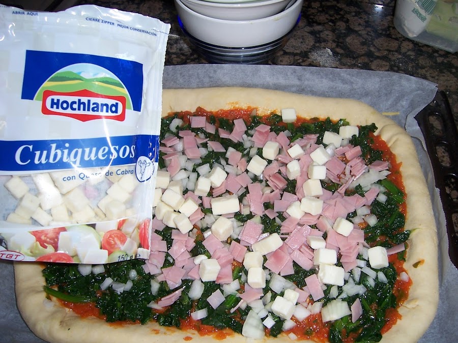 Añadimos y extendemos por toda la pizza el tomate, las espinacas, la cebolla, el jamon york y los cubiquesos.