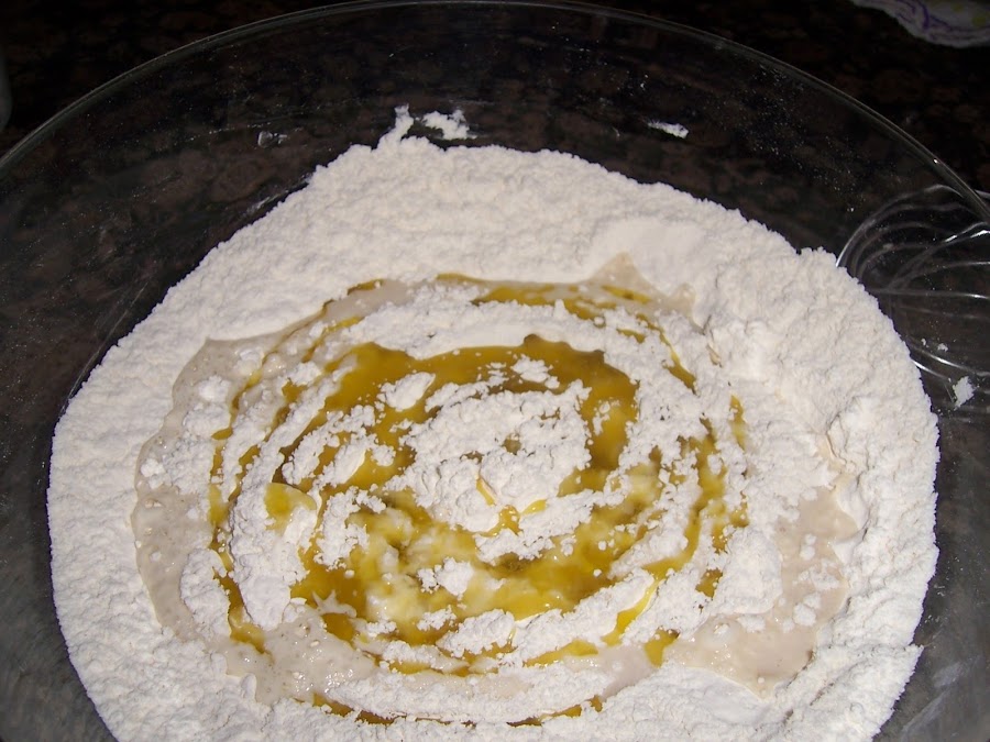 Añadimos la levadura en el agua templada y dejamos que se disuelva bien, la añadimos a la harina tamizada con un buen puñado de sal y el aceite de oliva, amasamos bien y dejamos reposar tapada con un paño húmedo en un lugar templado. Si tienes dudas ver Como Amasar