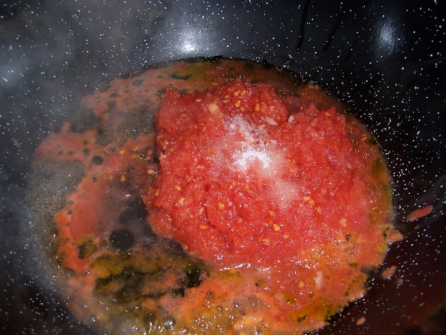 Rallamos los tomates y los ponemos a freír con un buen chorro de aceite, un pellizco de sal y otro de azúcar, este último sirve para contrarrestar la acidez del tomate, lo dejamos unos 10 minutos o hasta que cambie de color y evapore todo el agua.