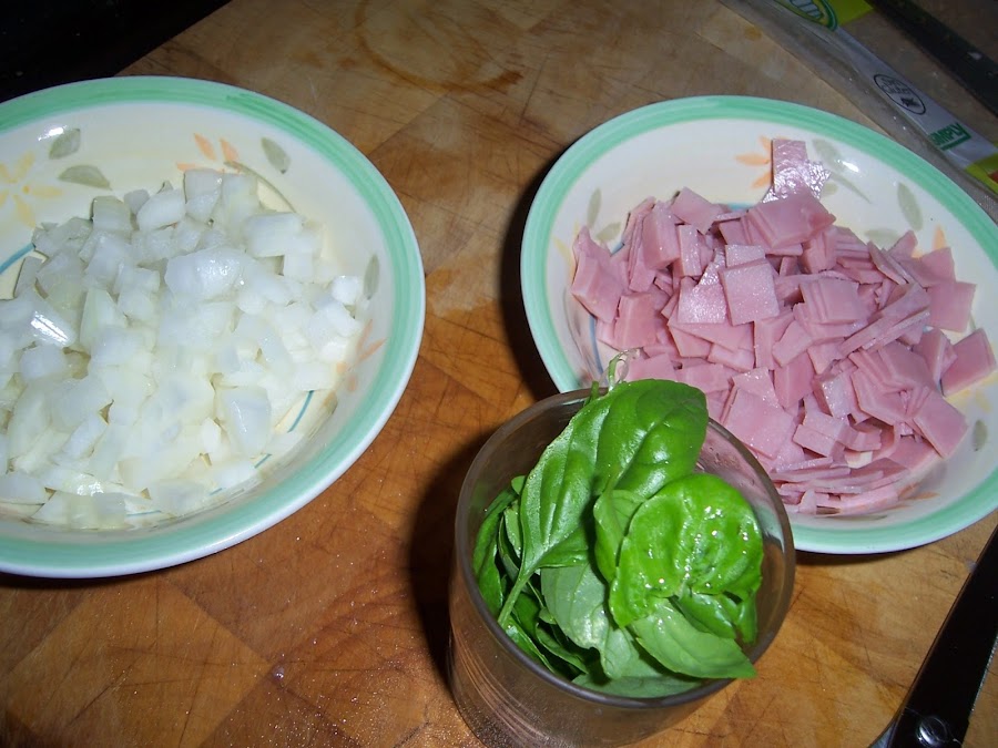 Mientras picamos la cebolla, el jamón york y la albahaca.