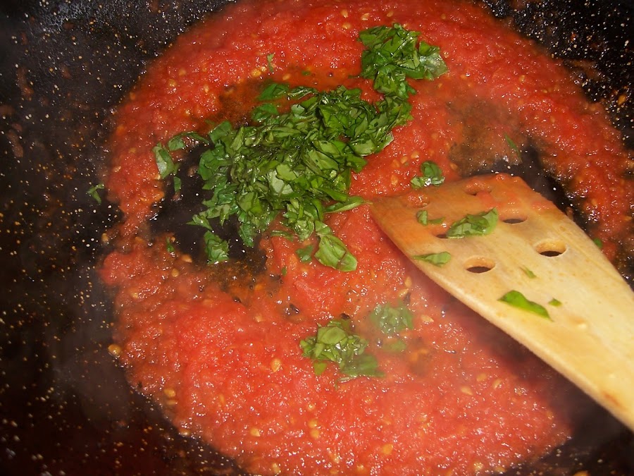 Cuando el tomate esté listo le añadimos la albahaca picada y apartamos.