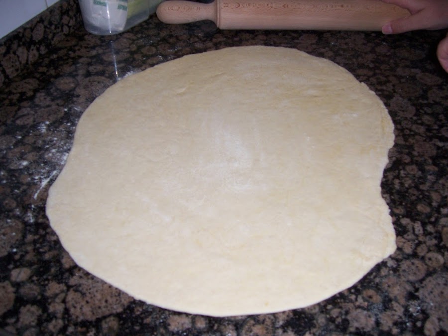 Rebajamos un poco la masa que habrá fermentado y estiramos contando que tiene que sobresalir un par de dedos fuera del molde.