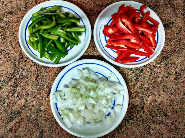 Añadimos todos los ingredientes cortados previamente los que así lo requieran: pimientos rojo y verde, cebolla, carne picada mixta (esto simplemente lo añadimos), pechuga de pavo rayada aunque la podéis cortar a daditos si queréis y por último los champiñones.