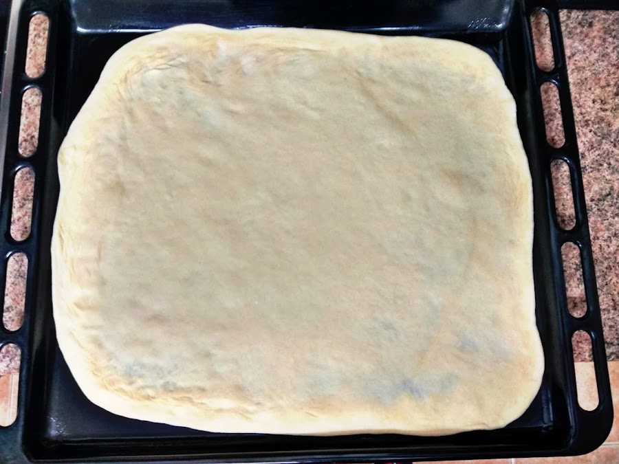 Untamos la bandeja del horno con el aceite de cornicabra de Oliveclub y un pincelito de silicona. Estiramos la masa y vamos acomodando a la bandeja con la yema de los dedos hasta que la ocupe por completo.