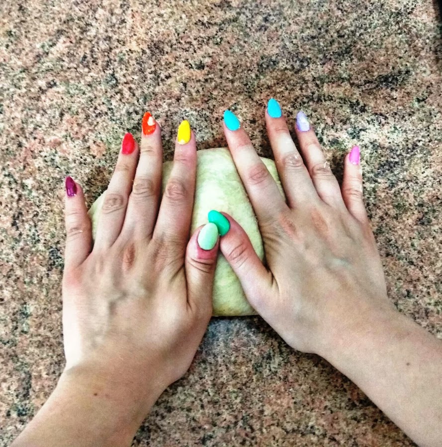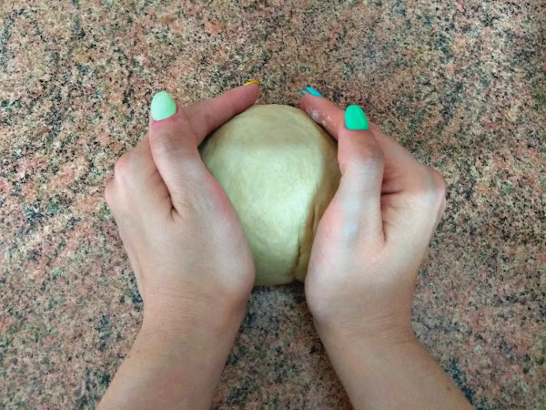 Una vez tengamos una masa más manejable, en un superficie lisa amasamos con las dos manos unos diez minutos. Cuando tengamos una masa bien trabajada hacemos una bolita. Dejar reposar 25 minutos en el bol tapado con film transparente.