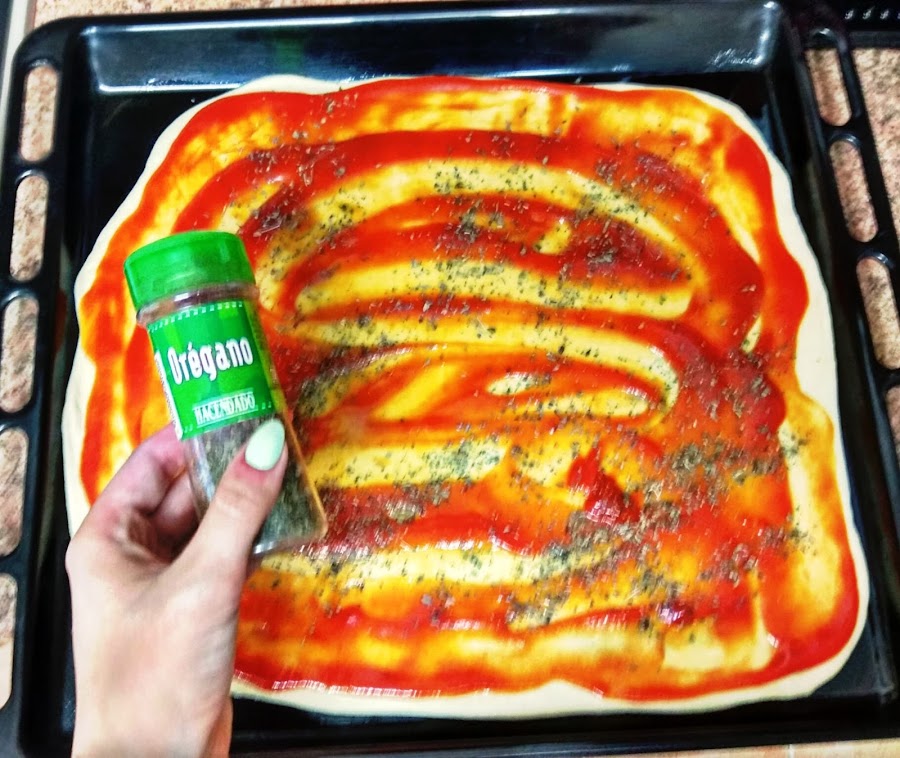 En la masa ponemos el tomate frito y extendemos con una cuchara que cubra bien toda la superficie. Añadimos el orégano que no puede faltar en ninguna pizza.