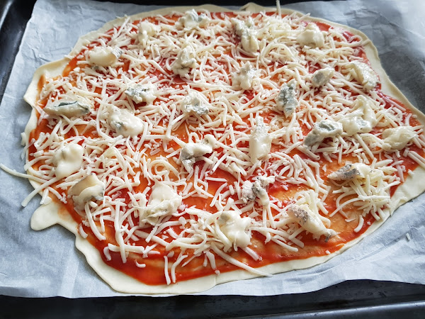5. - Y ponemos trozos de queso azul bien repartidos por la pizza.
