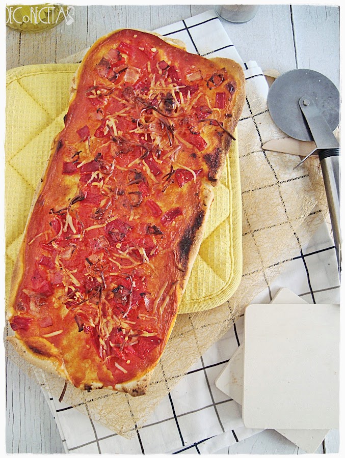 Dejamos reposar hasta que doble su tamaño y es tiramos la masa al grosor que queramos. Encima añadí tomate frito, pimientos del piquillo, bacon y queso rallado. Metí al horno a 180º por 15- 20 minutos.