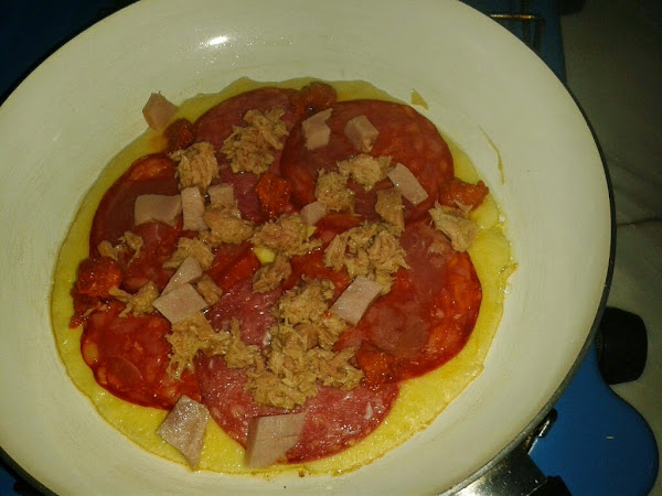 A continuación ponemos ingredientes que queramos poner en nuestra pizza, tomate frito, orégano, jamón york, atún, salchichón, chorizo, etc..... y por último queso rallado.