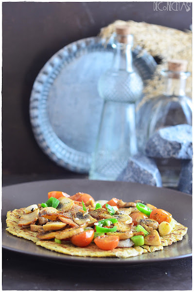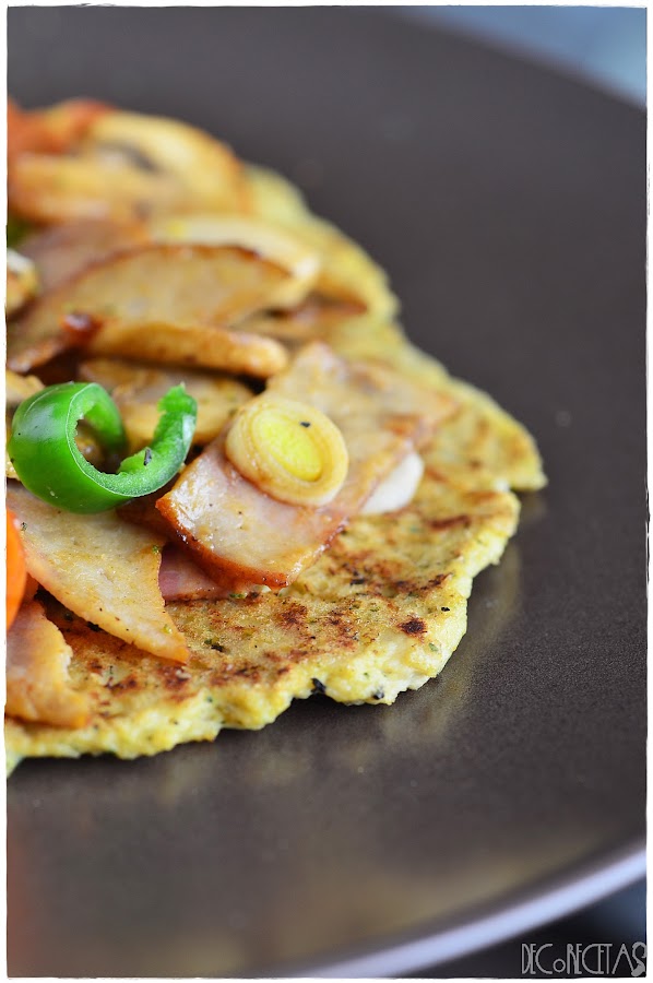 En esta ocasión en vez de hacer la masa al horno, la hice al fuego como en esta entrada, simplemente extendiéndola entre dos papeles de horno a la anchura deseada, en mi caso, finita, y depositando directamente sobre la sartén caliente, dando la vuelta cuando se valla cocinando