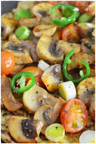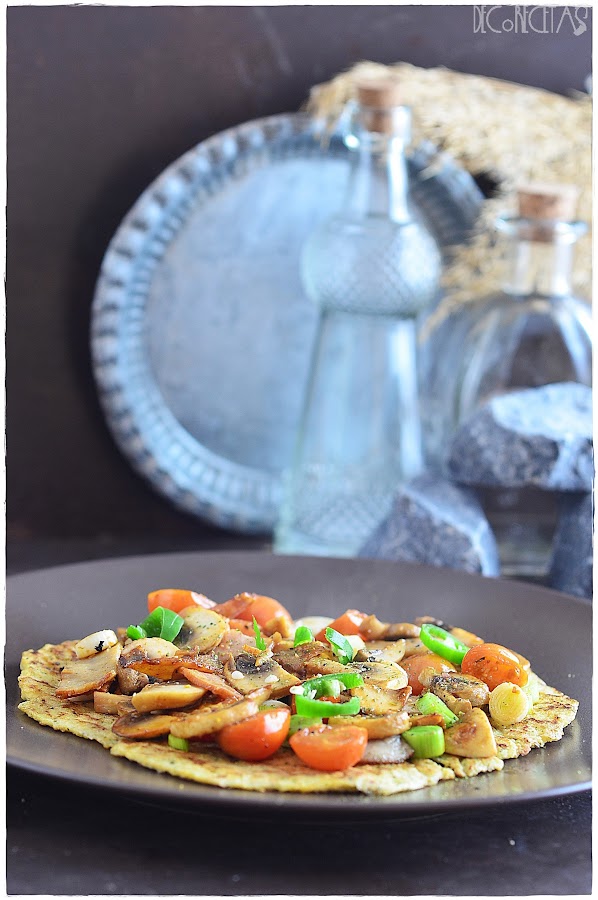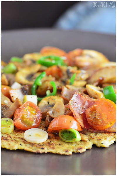 Por encima ya le añadís lo que os apetezca o tengáis por casa, en realidad eso es lo de menos cuando lo importante en probar la base. Yo añadí beicon de pavo, guindilla verde, tomates cherry, ajetes tiernos y champiñones