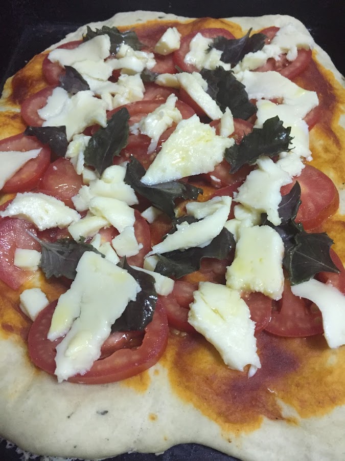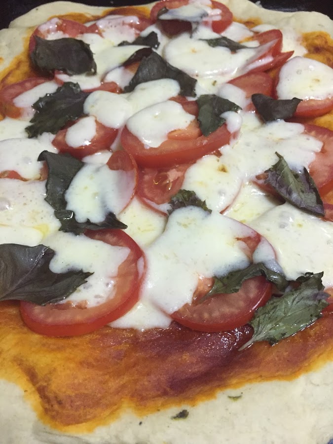 La sacas del horno, cubris todo con el tomate cortado en rodajas finas, .arriba le colocas la albahaca y el queso cortado.Rocias con aceite y llevas al horno hasta que el queso este derretido