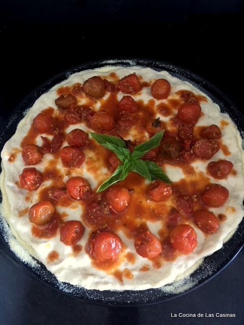 No es una Pizza Margarita típica ya que he utilizado unos cherrys y la salsita que se ha formado al confitarlos. Como ves no lleva salsa de tomate ni mucho pringue, ¿será más sana?