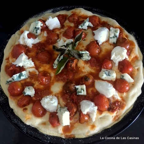 Rellena la pizza con la salsa que se ha formado y los cherrys junto con una hoja de albahaca. Introduce en el horno que has precalentado a 200º durante 20- 25 minutos, a mitad de los cuales incorporas la mozarella y el queso azul.