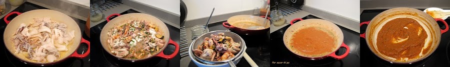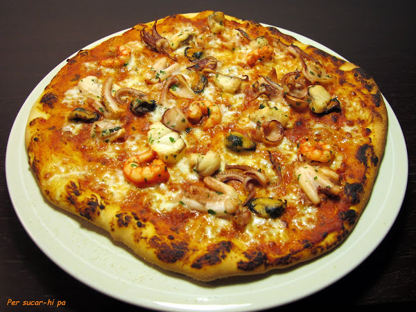 Así que vamos a divertirnos, que la pizza siempre es motivo de fiesta en la mesa. Para la masa utilizamos nuestra receta de masa básica de pizza que siempre da buenos resultados, y para el relleno pronto lo tuvimos claro, con sabor a mar. Así que con algún esbozo en la cabeza sobre el resultado final, un guiso marinero de pescado y marisco, nos fuimos de "pesca" por las paradas del mercado. Y tuvimos suerte: pillamos mejillones, pulpitos, calamares, unas preciosas gambas rojas y un rape que han dado mucho juego. Con todo ello a los fogones, esto que tenéis más abajo es lo que salió. Es una lástima que la tecnología actual sólo permita verlo, porque el aroma y el sabor son aún mejor que la vista.