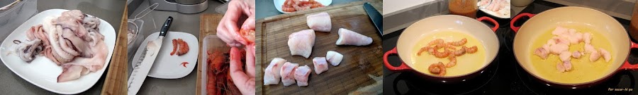Poner una cazuela al fuego con aceite de oliva y calentar. Pasar primero las gambas, vuelta y vuelta que tomen color, retirar. Hacer lo mismo con el rape, retirar.