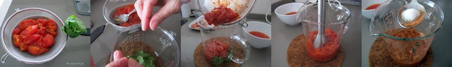 Para la salsa de tomate utilizamos unos de conserva casera, pueden ser naturales o de bote. En todo caso, pelados y escurridos. Colocarlos en el vaso de la batidora, añadir las hojas de albahaca, una pizca de sal y el azúcar y triturar. Reservar.
