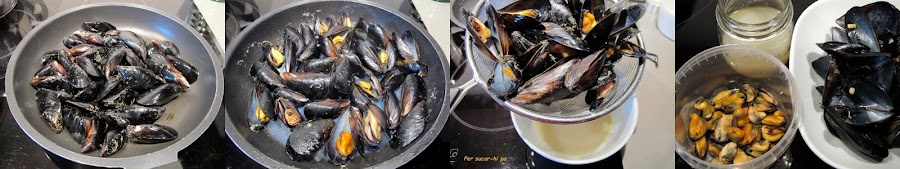 Colocar una sartén al fuego y calentar una cucharada de aceite, añadir los mejillones, tapar la sartén y esperar a que se abran, normalmente de 3 a 5 minutos serán suficientes. Verterlos en un colador y recuperar los jugos. Dejar enfriar un poco y separar la carne de las valvas. Reservar mejillones y caldo.
