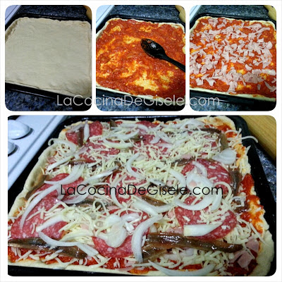Estirar la masa con un rodillo y colocarla en la bandeja previamente enharinada, bañar con la salsa napolitana, (mas abajo está la receta de la salsa) agregar queso mozzarella, jamon, salami, anchoas con lo que prefieras