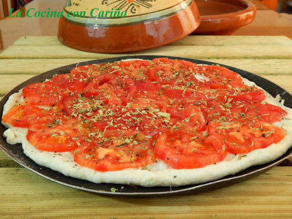 Encendemos nuestro horno y lo ponemos a 200ºC por abajo. Cuando alcance la temperatura, podremos empezar a meter dentro nuestra masa. Lo primero que haremos es preparar un capa lo más fina posible de masa que podamos y la colocaremos en nuestra placa de horno. Colocaremos el tomate, lo salpimentaremos y pondremos un poco de orégano. Meteremos en el horno unos 7 minutos.