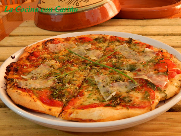 Hoy he hecho felices a mis cachorros y supongo que a la madre también. Generalmente la pizza la hago para las cenas y concretamente para la del viernes, los cuatro viendo una película insoportable de adolescentes o lo que es peor una infantil. Pero el momento es lo que vale, al menos eso creo yo. Pues hoy he decidido hacerla para comer al medio día y así poder fotografiarla, porque luz artificial al 100%, no me gusta demasiado.