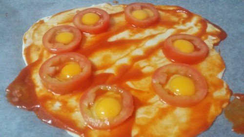 - Cortar el tomate en rodajas, despipetar y ponerlas sobre la base de la pizza.