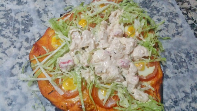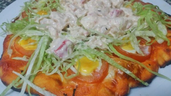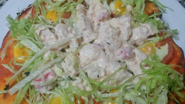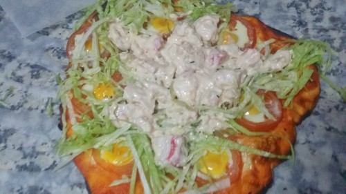 y distribuimos por toda la pizza sin tapar los tomates y los huevos; ponemos el coctel sobre la lechuga.