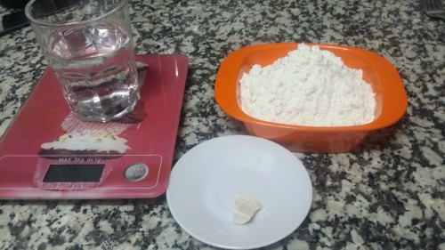 Poner la harina y la levadura en la mesa. Hacemos un agujero en el centro para echar el 80% del agua. Mezclamos con espátula o con la mano hasta conseguir incorporar todo el agua. Si es preciso, añadir el 20%restante, si la necesita. Si usamos máquina de amasado, poner la harina, levadura y agua y mezclar.