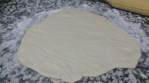 Teóricamente después hay que estirarla al aire como un gran maestro pizzero. En fin, yo he hecho lo que he podido y al final me ha quedado una pizza triangular. jeje