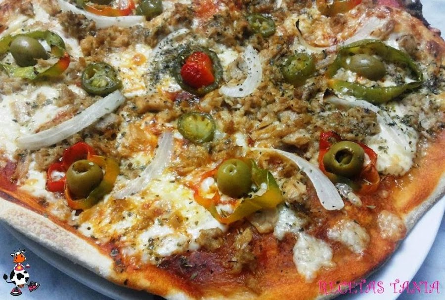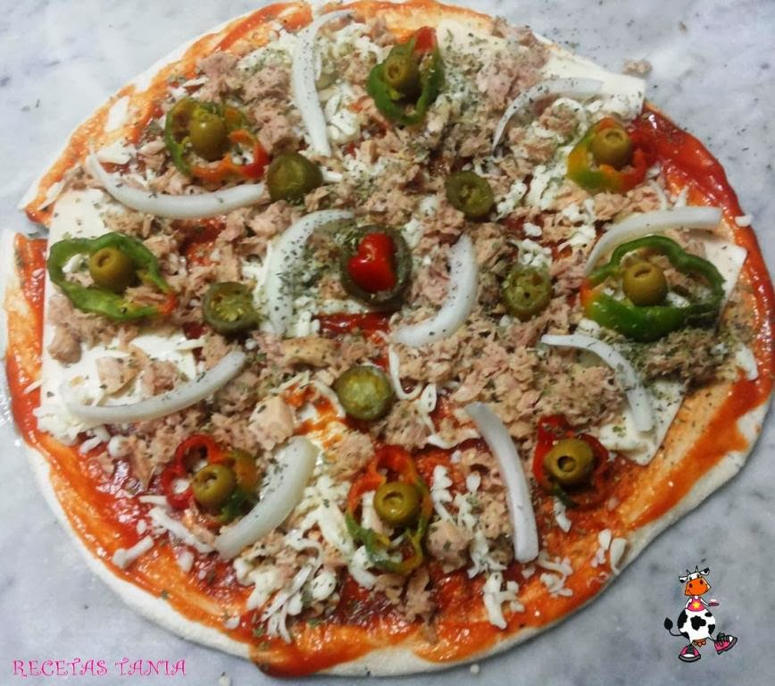Ponemos dos cucharadas de tomate frito y untamos en la masa,ponemos las lonchas de queso cubriendo toda la masa,y mozarella rallada. Añadimos el atún,las aceitunas, la cebolla en juliana y el pimiento rojo en rodajitas. Colocamos los jalapeños,espolvoreamos la pimienta negra molida y orégano. (decoramos al gusto). Metemos la pizza en el horno a 200º unos 15min.