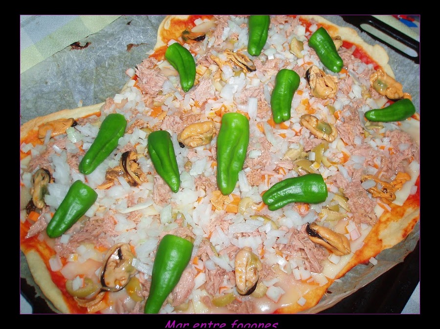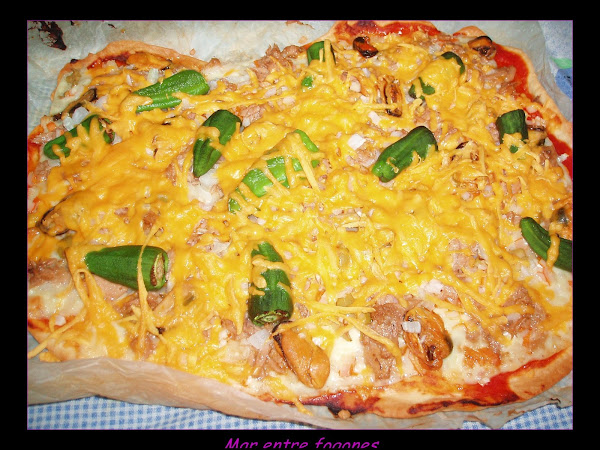 Una vez sacamos(sin apagar el horno) ponemos uno de los quesos, luego el atún, las aceitunas (yo las pongo partidas pero podéis ponerlas enteras), los mejillones, los pimientos del padrón sin rabito y por último el otro queso.