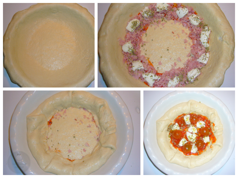 Rellenar cerca del borde con una cucharada de mojo,la mezcla de jamon y bacon,la mozarella, el orégano y la albahaca.
