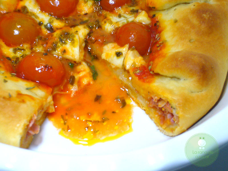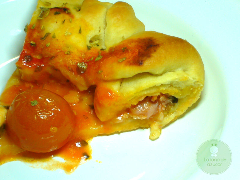 Este mes teníamos que preparar pizza ¿a quien no le gusta la pizza? en casa cae una todas las semanas o casi todas y para variar de lo habitual buscando,buscando me topé con esta de masa rellena, uff!!! RICA NO!! lo siguiente, nos ha gustado muchísimo y sin duda se queda entre nuestra favorita.