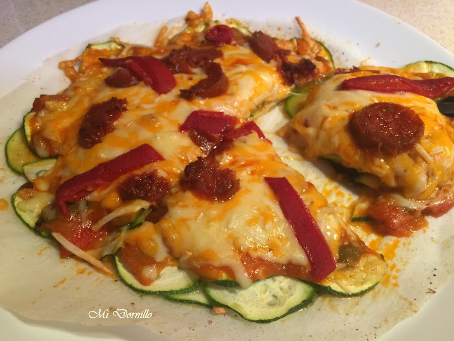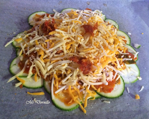 -Primero daremos forma a nuestra pizza con las rodajas de calabacin.