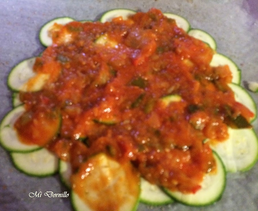 -Una vez hecho la base de calabacin le ponemos la salsa de tomate.