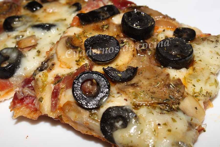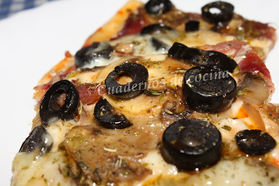 Colocamos la masa en la bandeja del horno sobre una hoja de papel vegetal y untamos de tomate (al gusto). Añadimos el queso en lonchas, los champiñones laminados, el jamón y las aceitunas negras. Partimos la bola de mozzarella en rodajas no muy gruesas y repartimos por la pizza. Espolvoreamos con orégano y metemos al horno (en el mío modo pizza, sólo por abajo) unos 12-15 minutos.