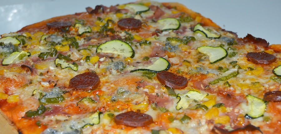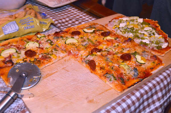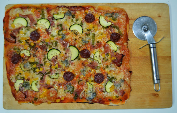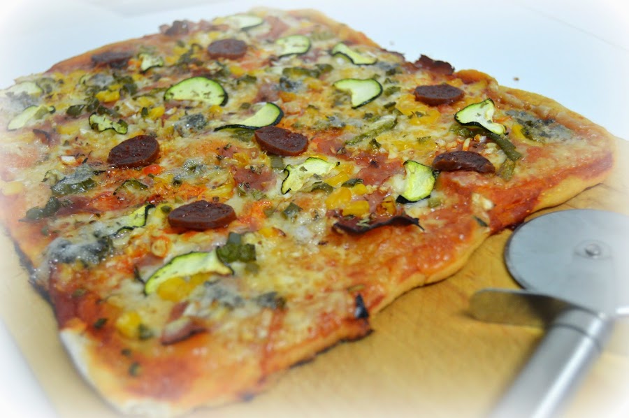 En mi casa las pizzas son como el resto de la semana. Las solemos hacer viernes, sábados o domingos y echamos todo lo que sobra o está abierto en la nevera, o bien todo lo que está al borde de caducar. De hecho ésta ha sido un buen ejemplo. No exagero, le cabe todo: trozos del chorizo de las lentejas, una lata de maíz sobrante de una ensalada, quesos azules, rallados, en polvo, en lonchas y hasta de untar (y éste último particularmente he descubierto que queda buenísimo); cebolla, pimientos, calabacín, pavo y jamón, taquitos de bacon, pollo cocido del mediodía o crudo, huevos viejos, lonchas de tomate... Y porque no se me ocurren más ejemplos!