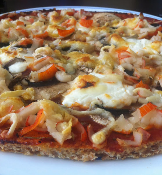 Otro toque personal que me gusta darle a las pizzas es ponerle unas cucharaditas de queso de untar sobre el tomate, le da un toque riquísimo. Y a partir de aquí, ya juega la imaginación y gustos de cada uno. La que yo casi siempre repito lleva una lata de atún y los palitos de cangrejo. Pero ésta vez aprovechando que tenía champiñones frescos decidí hacerla diferente.