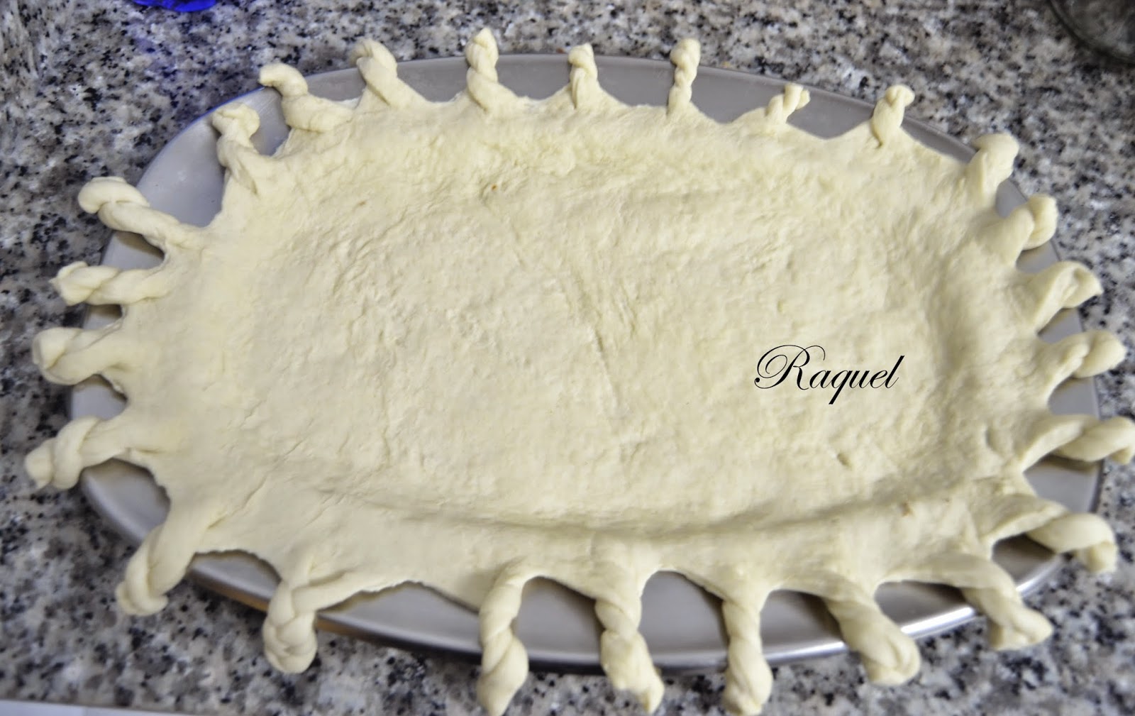 Volvemos a espolvorear el mármol con harina y volveremos otra vez a amasar la masa, hay que quitar el exceso de gas que se ha formado aplastando y presionando con los puños, después estiraremos la masa con un rodillo hasta que quede bien fina y le damos la forma deseada yo en forma de sol, haciendo unos cortes en los bordes y enrollándolos.
