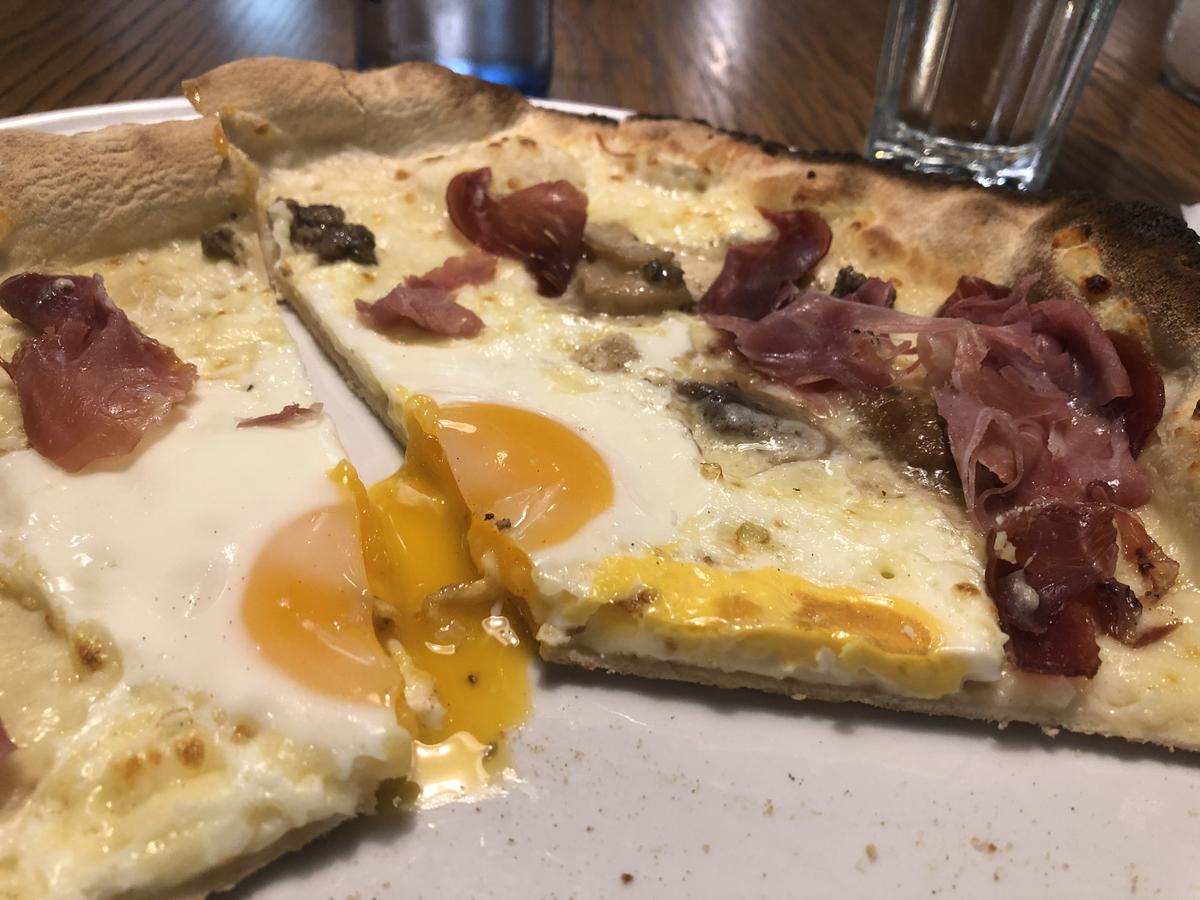 Nada más llegar la pizza a mi mesa me decepcionó, para mi gusto los bordes estaban demasiado tostados y uno de los huevos se les había roto por lo que estaba totalmente cuajado. Pero faltaba probarla, porque para mí lo más importante es el sabor. Los ingredientes de esta pizza son trufa, jamón, boletus y dos huevos, todo ello sobre una base blanca.